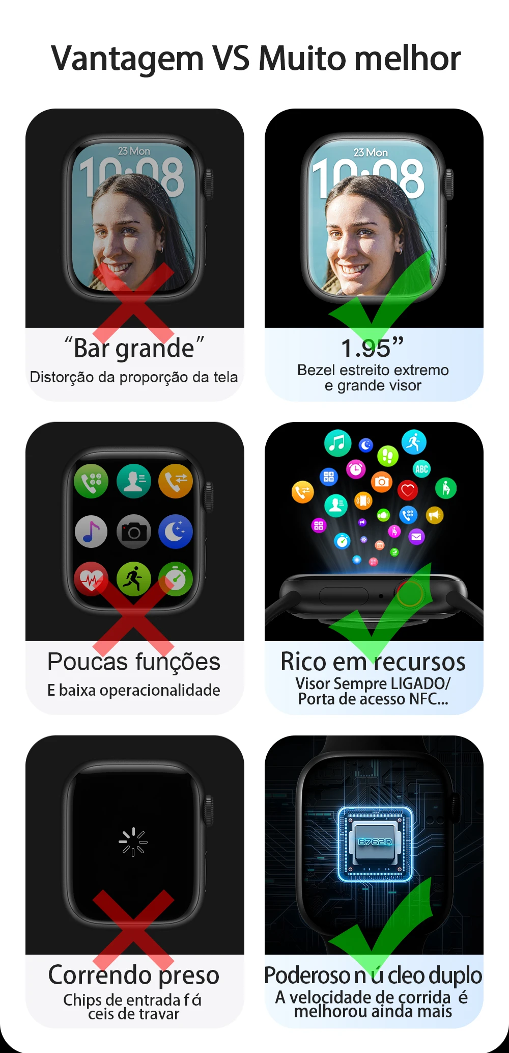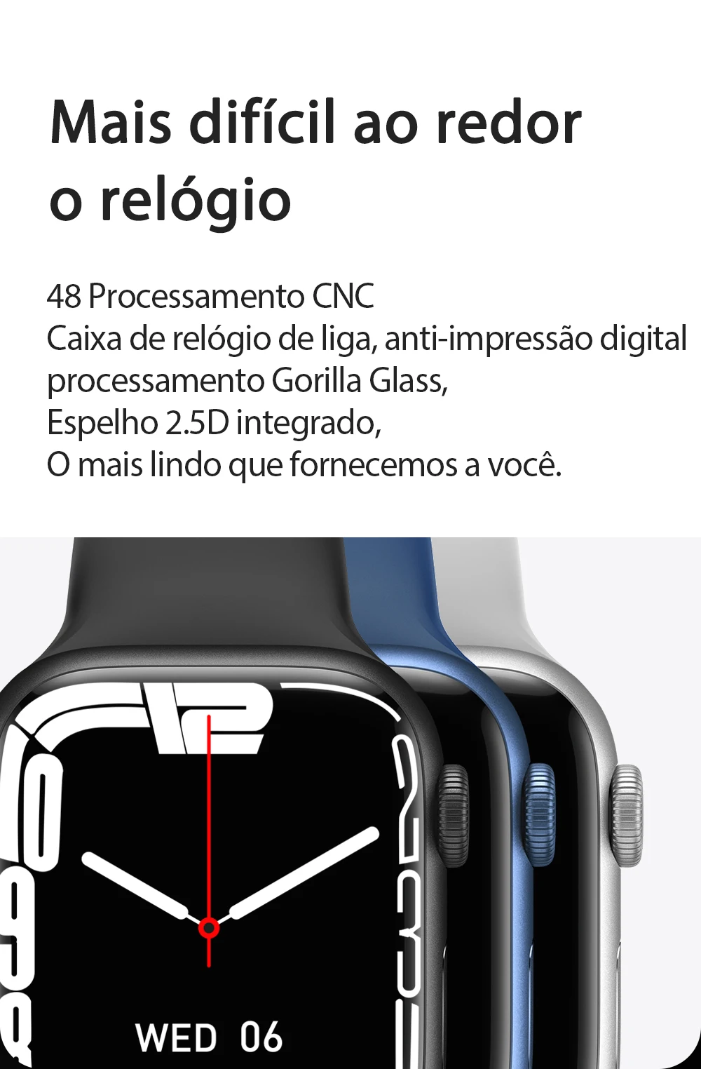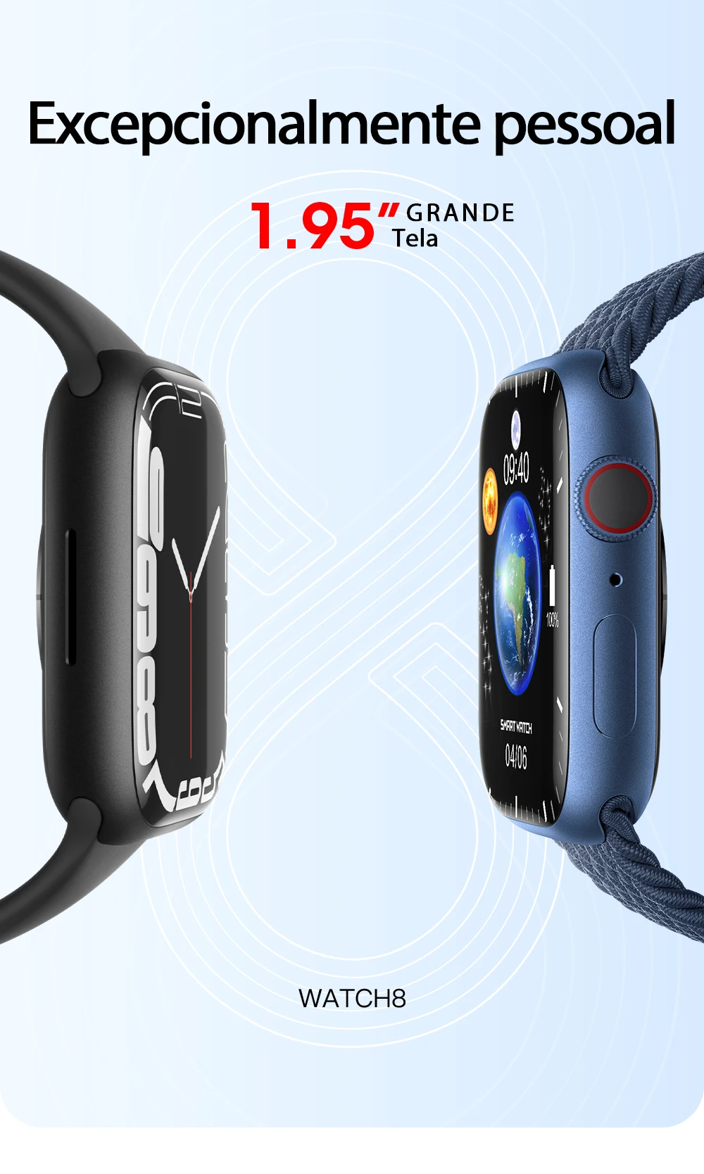 Principais características: 1. display de 95 polegadas, carregador sem fio, chamada bluetooth, siri, acesso à porta nfc, ringtone, sempre no modo, baixo consumo de modo duplo bluetooth. 500 + watchface baixar, exibição dividida, passlock, chamada bluetooth, freqüência cardíaca, bp, ecg, registro de período feminino.